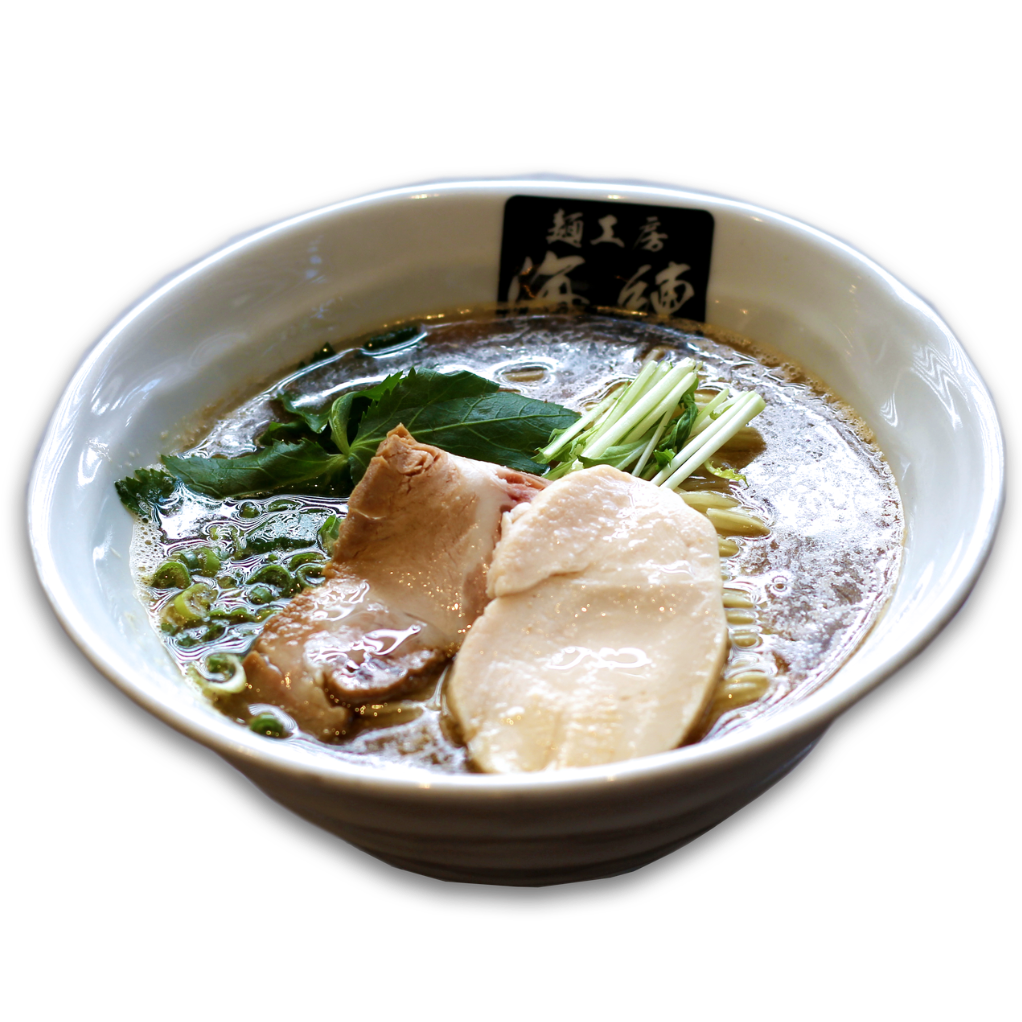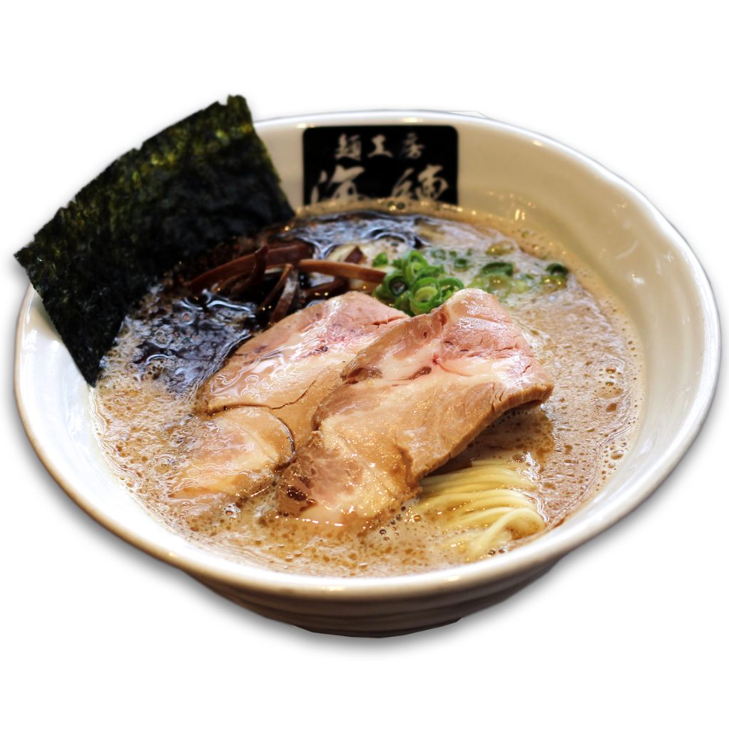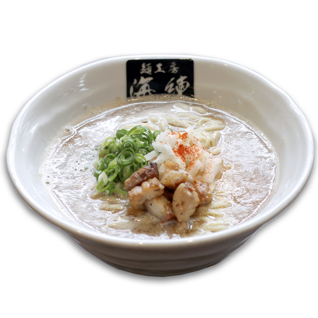 人気の麺工房海練の定番!魚介豚骨ラーメン。濃厚豚骨スープに魚介の旨みをプラス。刻みタマネギと刻みチャーシューが絶妙なハーモニー。