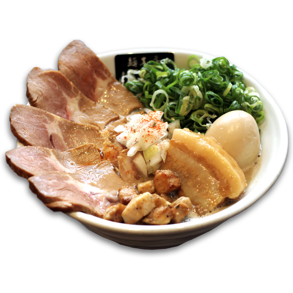 一番人気!魚介豚骨ラーメンの豪華版。濃厚豚骨スープに魚介の旨みをプラス。刻みタマネギと刻みチャーシューが絶妙なハーモニー。