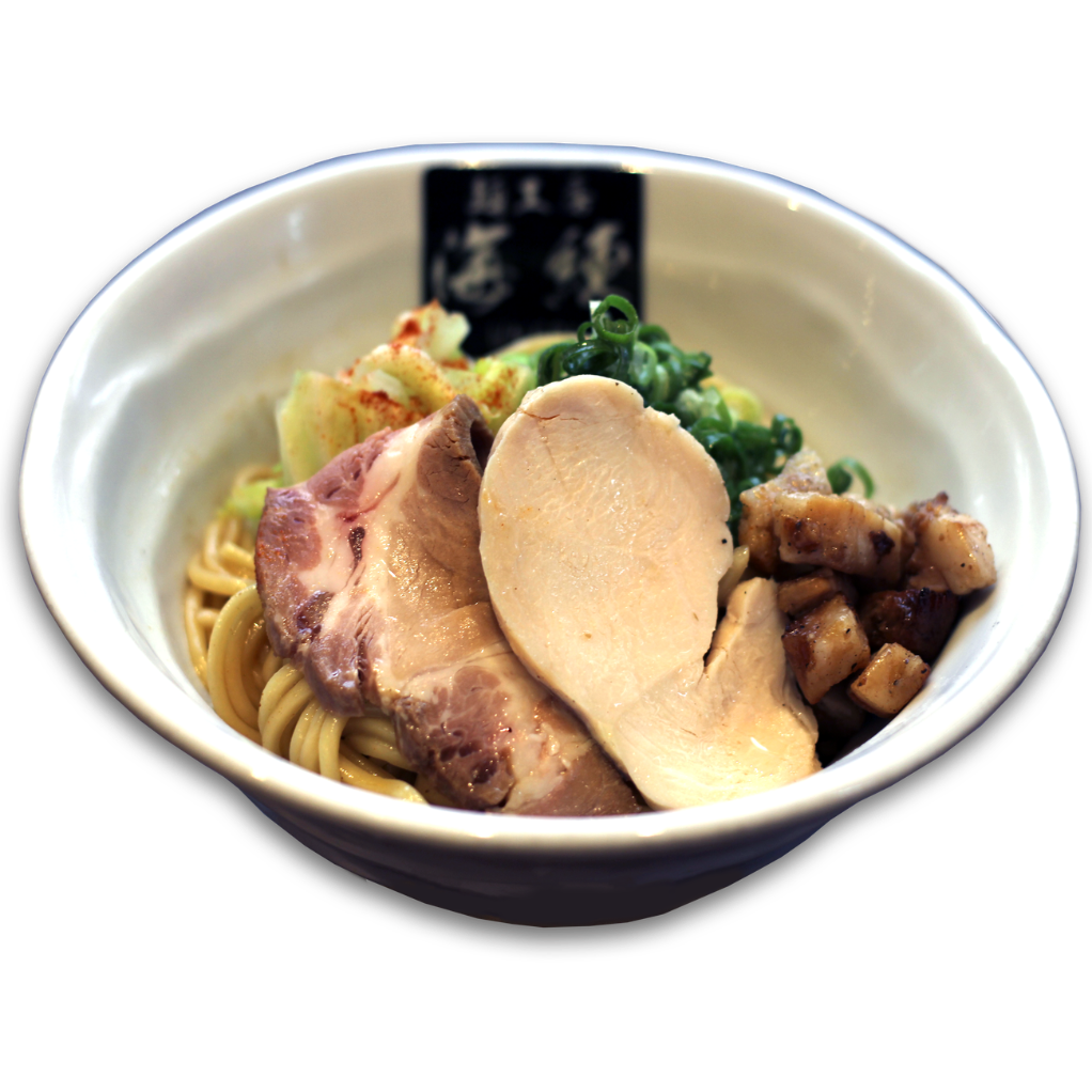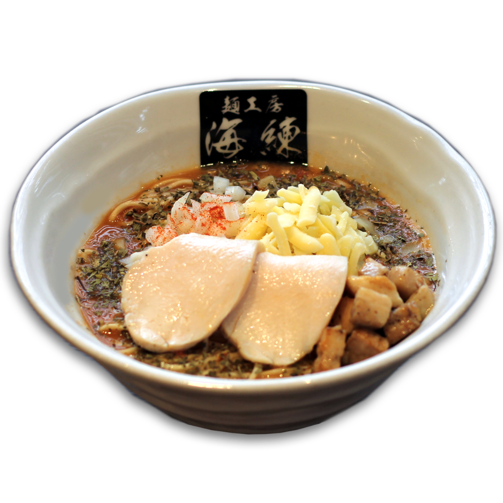 人気の麺工房海練の定番!魚介豚骨ラーメン。濃厚豚骨スープに魚介の旨みをプラス。刻みタマネギと刻みチャーシューが絶妙なハーモニー。